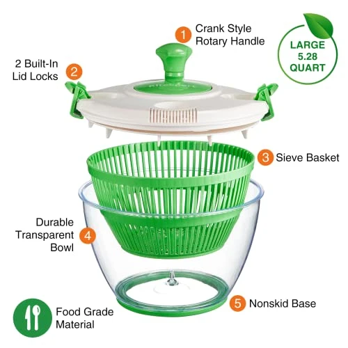 - Easy to Use: Ergonomic design, can be 360 degrees smooth operation, whether used to clockwise or counterclockwise rotation can be satisfied, easy rotation, saving both time and labor. Quick dry keeping the vegetable fresh and crisp. The large salad spinner has a capacity of 5.28qt which is enough to accommodate 4-6 vegetable salad servings for your whole family.