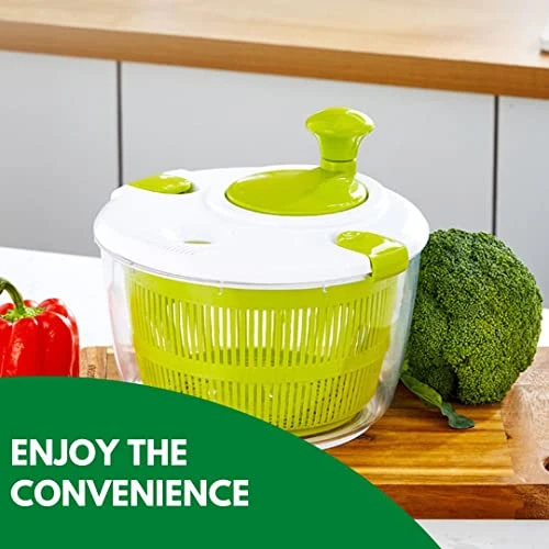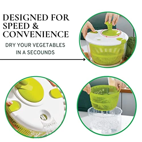 - MUST HAVE FEATURES : Simply rotate the large handle of the lettuce rotator to clean and dry the salad vegetables in a few seconds, allowing you to make multiple salads at once, saving time and effort .Our salad spinner is easy and ideal for both right-handed and left-handed users. With the spout design, this salad dryer spinner can remove all water from the vegetable dryer without removing the lid. The spinner is stain resistant making this spinner easy to clean through traditional hand washing only.