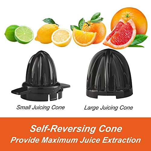 - 【41oz Large Capacity】The electric citrus juicer has a 41oz (1.2L) large transparent juice container with measure markings on which can meet the needs of big family and parties. It includes 2 cones for different size citrus fruit, and also comes with a protective cover to keep dust out.