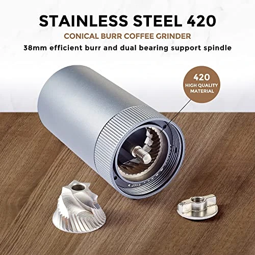 - [Fixed with Dual Bearing Design] Durable Stainless Steel 420 Conical burr coffee grinder, 38mm efficient burr and dual bearing support spindle make the grinding of coffee beans more detailed and even.you can grind enough coffee for your family within one minute.