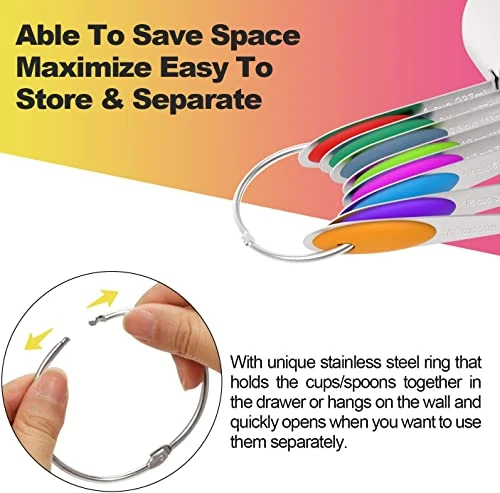- ❤ [EASY TO USE] With NON-SLIP SILICON HANDLES – is easy to grasp, non-slip even if use with sweating hands. Heat resistant, protect hands when doing high temperature cooking. With UNIQUE STAINLESS STEEL RING – holds the cups/spoons together in the drawer or hangs on the wall and quickly opens when you want to use them separately.