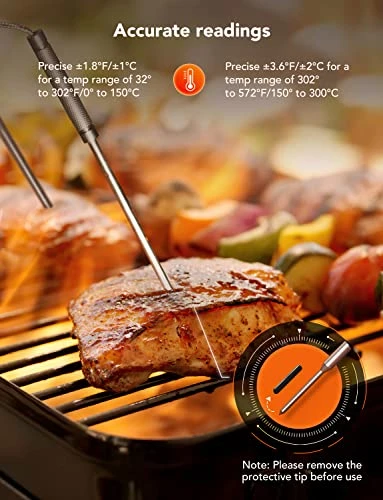 - Maintain The Flavors Of Your Food: The probe accuracy is ±1.8°F/±1°C while the temp range is 32° to 302°F/0° to 150°C. Stay informed on how your food is cooking in the kitchen or outside on the grill to achieve the flavors you want.
