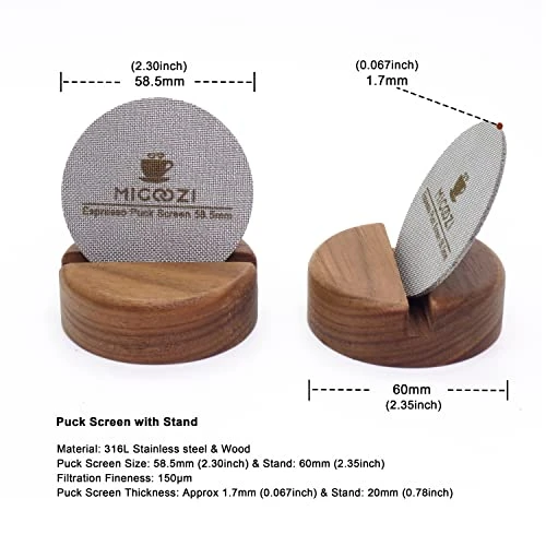 - This puck screen set consists of a 58.5 mm filter screen and a wood stand, It’s easy to pick up and place to use when you’re making espresso and can keep the neat desktop; It’s the best tool and gift for baristas and espresso lovers.