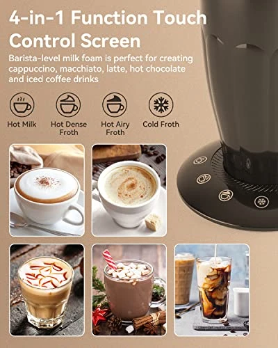 - ☕4-in-1 Function Touch Control Screen: Milk frother and steamer creates warm milk, light warm foam, thick warm foam & cold foam at a touch in 1-2 minutes, you can blend it with espresso to create cappuccino, macchiato, latte, hot chocolate and iced coffee drinks