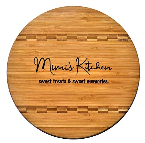 - STRONG & DURABLE: Our Engraved Bamboo Butcher Block Inlay Cutting Board Measures 11 3/4” around and weighs 1.6 lbs. providing space for vegetable chopping, slicing fruits, and cutting meats. Won’t dull your kitchen knives. This is a kitchen decor keepsake gift for mom from daughter or a great gift for mother from her son. MiMi will most likely treasure this one as a kitchen decor and display it in her kitchen for years to come.