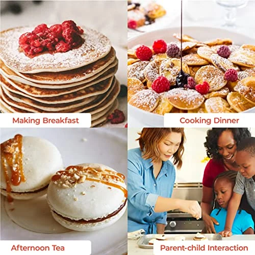 - 🥞【Wide Application】This mini pancakes maker machine is suitable for baking dorayaki, muffins, crepes, poffertjes, Dutch pancakes. It is widely used in home, restaurants, bakeries, canteens, breakfast stores, cafes, and other food industries.