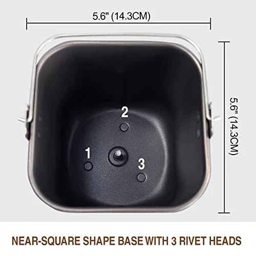 - CONSTRUCTION AND DIMENSIONS – An aluminum pan coated with food grade nonstick Teflon; PFOA and BPA free. – Near-square shape base with THREE (3) rivet heads on the inside bottom and FOUR (4) bulge locks on the outside bottom – 5.6 inches x 5.6 inches (14.2cm x 14.2cm) base and 6.5 inches (16.5cm) tall. – Please ensure your original pan has the identical structure and dimensions to KitchenArm, especially the THREE (3) rivet heads and FOUR (4) bulge locks (also refer to product photos).