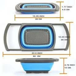 - [FLEXIBLE USE – ADJUSTABLE]: This nifty over the sink strainer is your hands-free solution for rinsing, draining, and drying. Its flexible design expands 15.35 to 23.6 inches, allowing you to easily adjust to your sink size! Use in the raised position as an over sink strainer or quickly switch back to the smaller collapsible colander size to drain within your sink or save space for storage.