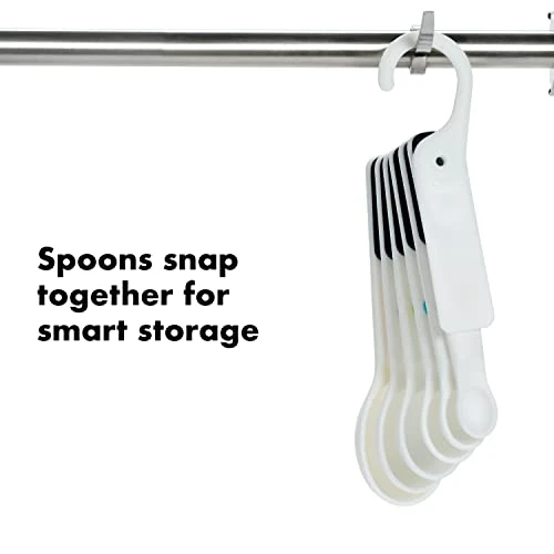 - Spoons fan out while snapped together to make it easy to find the right size