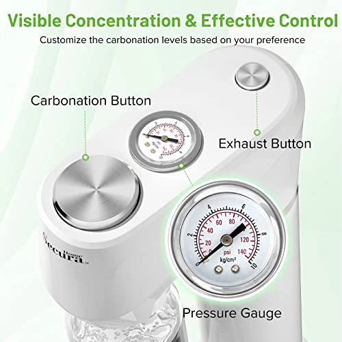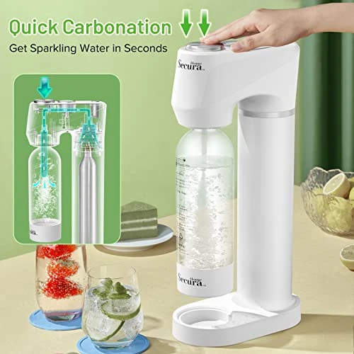 - ⏰Visible Pressure Gauge: Secura Home sparkling water machine comes with a unique visible pressure gauge design. You can customize the carbonation levels based on your preference according to the Pressure Gauge. After getting carbonated soda water, you can get a homemade DIY drink by adding fruit (lime🍋, watermelon🍉, mango)+ice cubes+mint +soda water. Tip: Using refrigerated water will give you a better fizz!