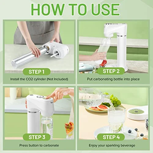 - 🌳Energy Saving & Environmental Protection: One CO2 cylinder produces 1980Oz soda water, replacing 180 disposable plastic bottles. Our sparkling water maker incorporates a cordless design, and does not require batteries or power required o matter at home or outdoors, you can get the happiness of carbonation anytime, anywhere, say goodbye to high-sugar plastic bottled drinks, and protect the environment.