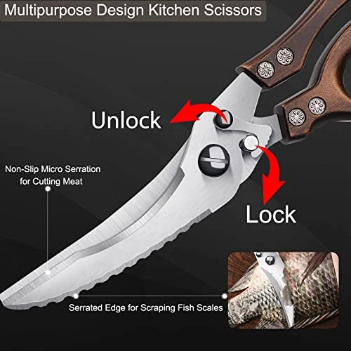 - 【MUCH SAFER & COST-EFFECTIVE KITCHEN SHEARS】The kitchen chicken scissors come with a safety lock is much safer and more convenient for cutting chicken breast, wing, brisket. Also, the kitchen poultry scissors save your time between switching the knife and other kitchen tools. The sharp kitchen shears have great flexibility, operability and are more cost-effective and maneuverable than a cutter.