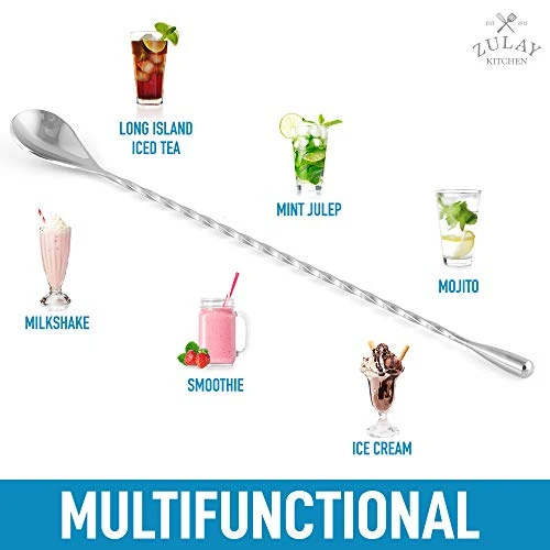 - VERSATILE MIXING SPOON: Whether you want to make fancy cocktails at home or give a gift to your friend, this cocktail stirring spoon is a perfect addition to anybody’s bar accessories. Use it as a martini stirrer, cocktail muddler, or take advantage of the length to get that last bit of mayo or sauce out of the jar.