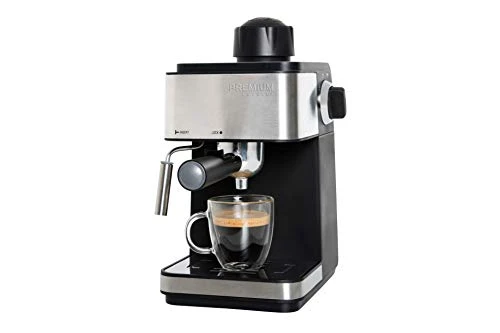 - Black and stainless steel housing complements any kitchen decor. 3-In-1 espresso, cappuccino and latte maker with glass jar with 2 and 4 cups level marker. Power: 800 Watts.