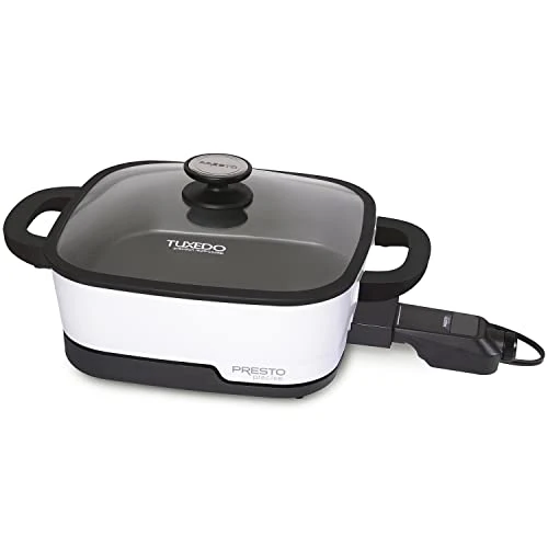 The Tuxedo™ 12-inch precision skillet with digital heat control takes skillet cooking to an exciting new level. The digital interface with large LED display lets you choose exact temperatures from 100° to 400°F for precise heat regulation, even at low temperatures. Built for versatility with extra-high sidewalls and ultra-durable ceramic surface, the skillet is ideal for pan frying, sautéing, roasting, braising, steaming, simmering soup and stew, poaching, sous vide cooking, making yogurt, and proofing dough. Select temperatures in one degree increments from 100° to 205°F and five degree increments from 205° to 400°F for consistent results every time. Use the multi-purpose rack for steaming and sous vide cooking, as well as making yogurt and baking potatoes. The tempered glass cover with silicone rim, easy-grasp handles, and a sophisticated design make the Tuxedo™ skillet both functional and stylish when entertaining. The digital control keeps food at precise serving temperatures for up to 24 hours. With a ceramic nonstick surface, inside and out, the skillet is easy to clean and fully immersible with the digital control removed. Delicious recipes included for pan frying, braising, poaching, sous vide, yogurt, desserts, and much more.