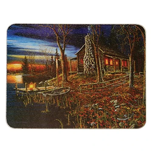 - Features artwork of a log cabin alongside a lake at sunset; can be used with all food types