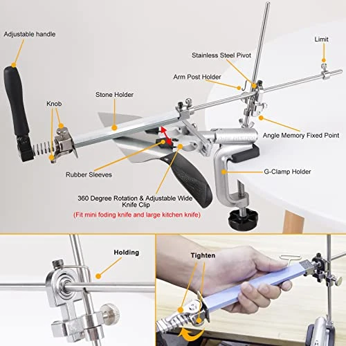 - Improve Fixed Angle Design: The innovative 360 degree flip design allows to flip over to sharpen other side with a deviation of +/- 2°, you can unscrew the screw on the vertical rod to adjust the ideal angle you want quickly, restore knife blades quickly and safely (Attention! If your phone has no rangefinder tool to help set the accurate angle, please download Measure APP)