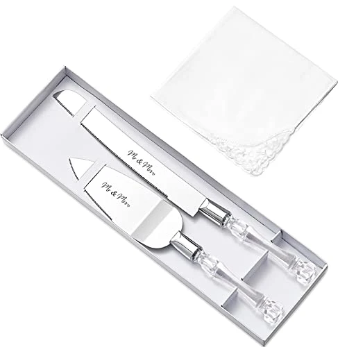 - Gift Set Details: Cake Server is 10.8 inch long, Cake knife is 13.2 inch long. Imitated crystal handles with stainless steel blades. White Lace Handkerchief is 10 inch*10inch .