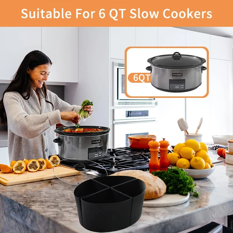 - 【Food Grade Silicone Material】These silicone slow cooker savers are Made of high quality food grade silicone, BPA free, phthalate free, latex free, lead free, non-toxic chemicals. It can be cooked safely in a slow cooker. In addition, the food in the silicone line was cooked through, slow cooker dividers are resistant to heat up to 446°F(230°C) to retain food nutrients and moisture.