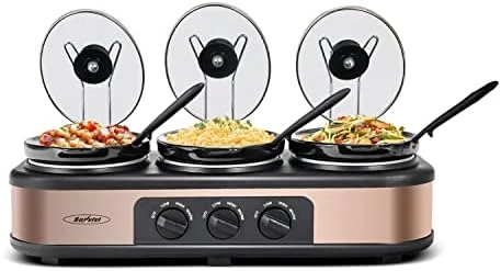 - [OVERHEAT PROTECTION] – Each crock has its own heating element with three settings, high, low, and warm, choose high temperature to cook sirloin potatoes, chicken soup, and rice, heat preservation to keep the food at a constant temperature, or use low temperature to heat chocolate and cheese. No matter which temperature mode you choose, we will ensure the temperature and humidity of the food. It will not cause the moisture loss of the food and maintain the best taste.