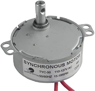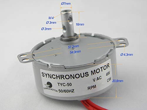 - 【Specification】 Product Name : Synchronous Motor; Model : TYC-50; Shaft Diameter: 7mm ; Shaft Length: 16mm; Direction : CW; Voltage:AC 110V-130V; Speed : 15-18RPM;Power: 4W;Torque:≤1.8kg.cm;Frequency:50/ 60Hz;