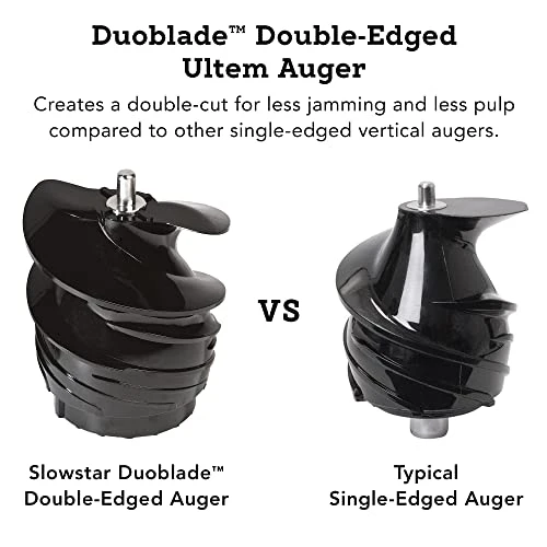 - DUO-BLADE ULTEM AUGER: The vertical cold press juicer features duo-blade that creates two times more cutting action. The auger rapidly cuts and crushes your produce while extracting more juice with less pulp.
