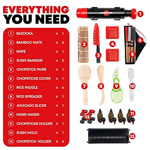 - DIY Sushi Maker Kit – Your Sushi Me sushi kit for beginners includes. sushi bazooka easy roller, nigiri sushi mold, rice paddle and spreader, chef’s knife, sushi cutter mold, avocado cutter, bamboo sushi mat roller, chopsticks and bag, chopstick holders, sauce dishes, as well as an instruction manual. All of the specialty tools and gadgets in your sushi rolling kit are made of premium bamboo and food grade plastic. Pro Tip, wrap the easy press mat in plastic cling wrap for a quick clean up.