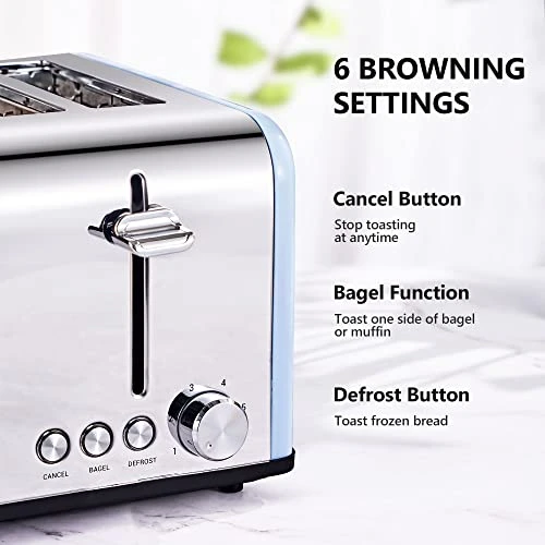 - Basic Toasting Features: 3 Basic functions with Bagel /Defrost /Cancel (red LED indicators), 6 browning control, solid high lift lever, extremely meet all your daily toast needs