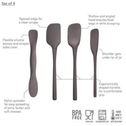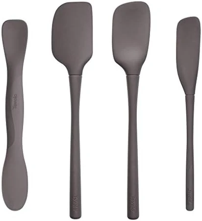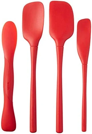 Outfit your kitchen with all your favorite Tovolo essentials with this Set of 4 All-Silicone Kitchen Tools. With a Flex-Core Spatula, Spoonula, Jar Scraper, and Scoop & Spread, this set is a great gift for foodies, new homeowners, college students, and more. Each item in the set is reinforced with a sturdy nylon core for rigidity and strength. This combination offers a solid core that can tackle thick batters and hearty doughs while the flexible edges provide just enough give to scrape the edges of the bowl clean. BPA-free silicone is scratch-resistant, stain-resistant, and food-safe for the best possible kitchen tool. The soft-touch silicone will not scratch pans, making it a gentle and safe choice for nonstick and cast iron cookware. Silicone is heat resistant up to 600 degrees Fahrenheit. The completely smooth silicone surface of the Spatula allows for even spreading, and edges are tapered to a sharp point to scrape sides clean. The Spoonula offers the best of what spatulas and deep spoons have to offer. The Jar Scraper’s long, narrow head fits into small jars, and the angled head ensures you can reach into corners to scoop out every last bit of your peanut butter, jelly, jam, preserves, nut butter, mayonnaise, condiments, and more. And the Scoop & Spread features a gentle, silicone-coated spoon, so you can scoop up jams, jellies, and condiments, leaving a clean jar behind. The smooth, flat nylon end is perfect for spreading soft cheeses, nut butter, and similar substances. Both ends are heat-resistant and scratch-resistant, so you can use them in your non-stick cookware without worry. Made of nylon and BPA-free silicone.