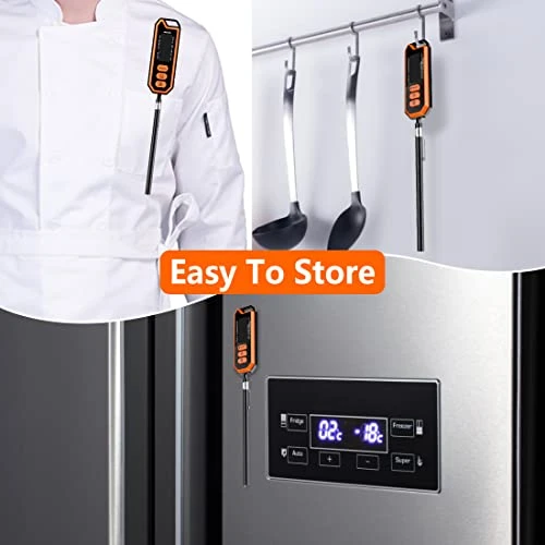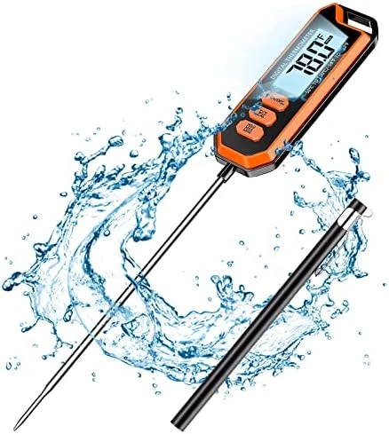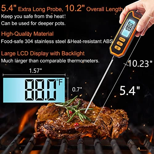 - [ Long Probe & Large LCD with backlight ] The 5.4″ super long probe made of 304 stainless steel keeps you safe from heat. The 1.57*0.7 inch large LCD screen with backlight is much larger than other similar thermometers. Clearer and easier to read.