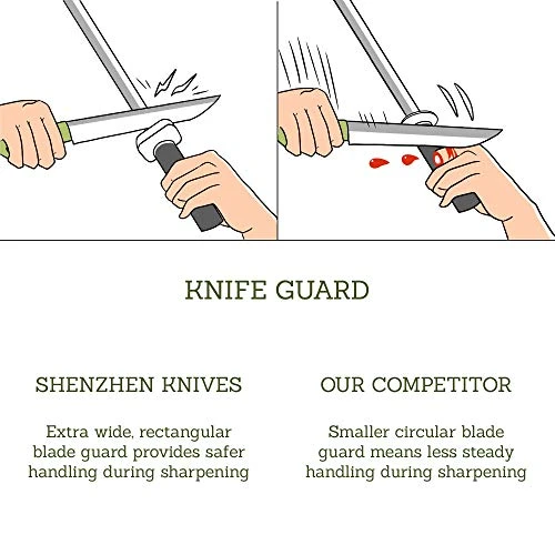 - RECTANGULAR BLADE GUARD: The wide nylon handle fits comfortably into your hand and the rectangular blade guard is reinforced with zinc alloy to protect you from stray knife strokes while sharpening