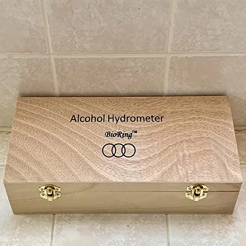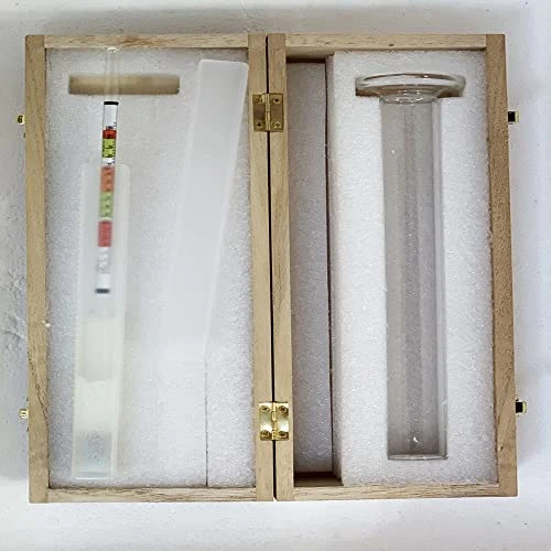 This is a perfect tool for wine and beer brewing, Mead, and Kombucha making. Triple Scale Hydrometer with a Designed Glass Test Jar Combo. It comes with a hand-made wood box. Materials: glass and wood