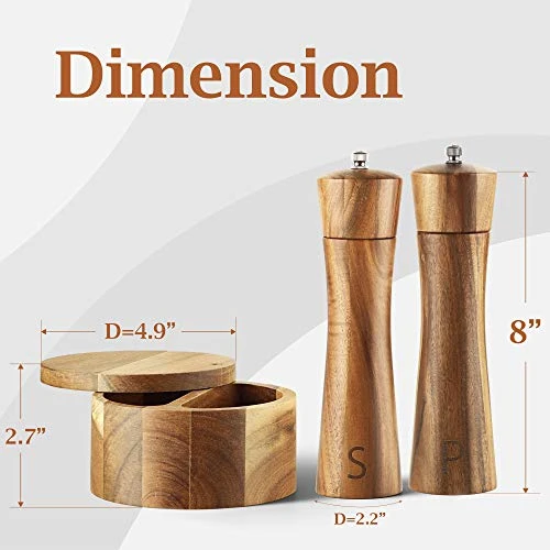 - ✔️ Premium Quality: Our salt and pepper grinder set are made from high-quality material that makes it a durable product. The natural acacia wood body of salt and pepper mill keep your spices safe inside even for long term use, along with high-quality stainless steel and ceramic, ensures long-lasting and flawless performance. The perfect blend of exquisite craftsmanship with quality material makes salt and pepper grinder the most desirable item