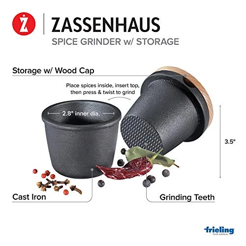 - FUNCTIONAL STYLE: This attractive, functional, high quality grinding set will live permanently on your countertop because you will use it often. This manual spice grinder comes with 3 pieces: the outer cup, the inner grinder, and the lid. The bowl and grinder are made of traditional cast iron, and the lid is made of beech wood to securely store ground spices, herbs, and seeds. Simply place herbs or spices in the cup and twist to grind, pour into the outer cup, then put the lid on top to store.